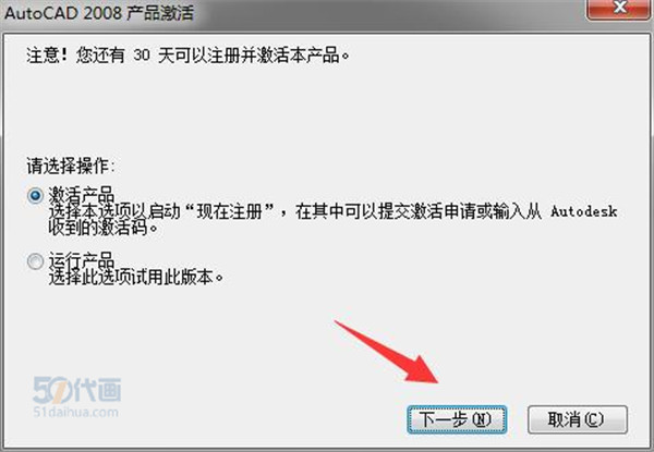 - 打开cad,会出现产品激活对话框,选择激活产品,点击下一步。