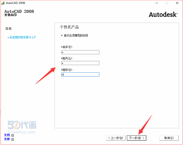 - 此处用户信息自己随意填写即可 点击“下一步”继续安装。