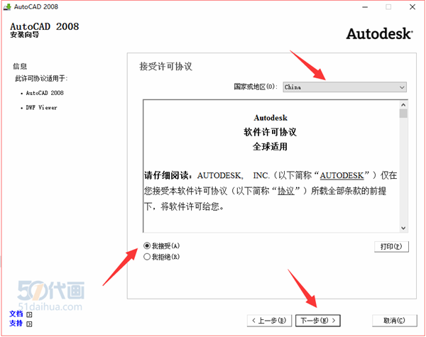 - 国家地区选择“China”勾选“我接受”点击“下一步”继续安装。