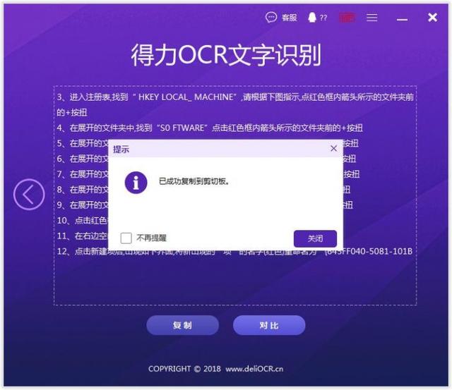 最后,识别结果出来后,就可以点击下方的【复制】按钮,将文字粘贴保存起来。建议保存文字的时候校对一遍结果,可以点击【对比】按钮,直接对比识别结果。不管是哪款文字识别软件,都不能百分百正确,会因为图片的清晰度,以及图片上的特殊符号等原因影响到图片的识别准确率。