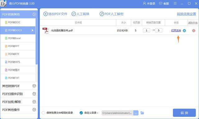 一、运行得力PDF转换器,因为软件默认的就是"PDF转DOCX",所以我们可以直接把PDF文件拖动到软件上来,也可以点击"添加PDF文件"添加PDF文件。