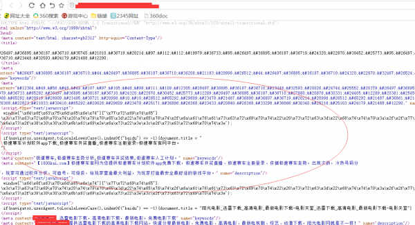 下面的这一段代码是加密的JS跳转代码,是根据百度搜索等相应的条件,进行判断,然后跳转,直接输入网站域名不会跳转。