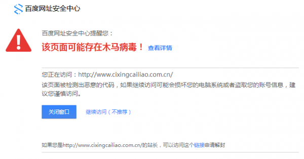 网站在百度的搜索中会直接风险提示:百度网址安全中心提醒你:该页面可能存在木马病毒。
