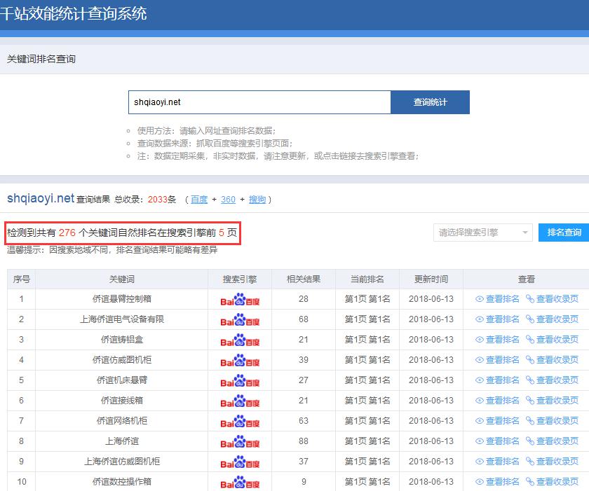 使用站群系统优化45天,收录页面1695个,其中276个关键词自然排名在搜索引擎前5页