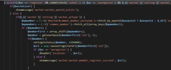 漏洞的产生是在plugin文件夹下的wechat目录里的wechat.inc.php代码中的220-240行的代码里,代码如下: