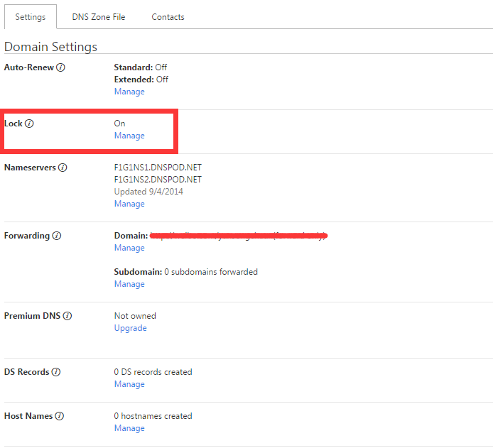 3、点击Launch后,会跳转到你的域名详细信息页面,在这个页面上,我们需要对域名进行解锁,如果不解锁,是无法成功进行域名转移的。看下图中红框圈起的地方,“LOCK”栏,点击Manage,将ON修改为Off。