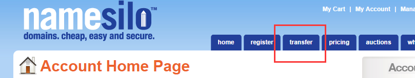 6、在namesilo页面上,找到transfer页签,点击页签后,会跳转到转入页面上进行操作。(不得不吐槽下namesilo页面很粗糙)。