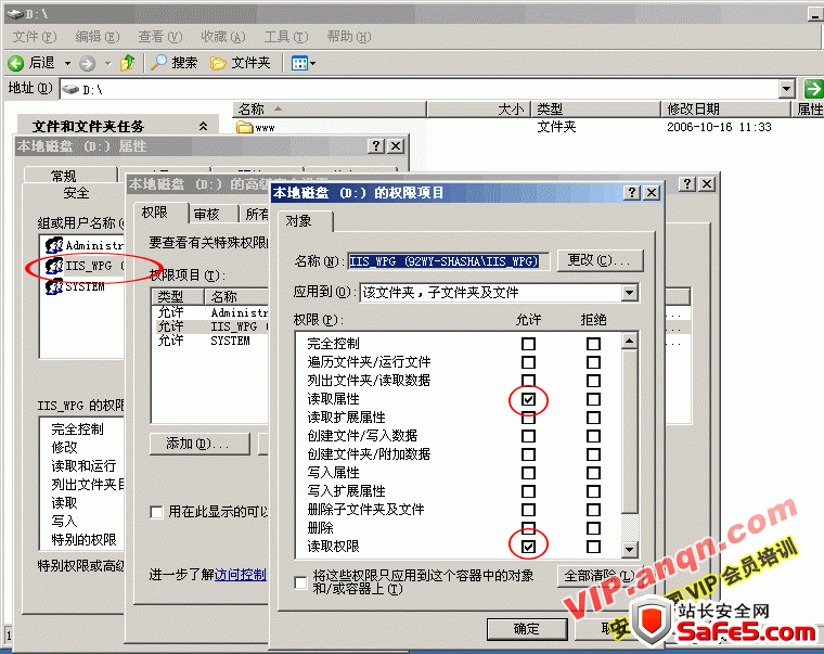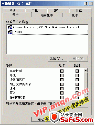 ⑴D盘根目录的权限设置如下,只保留Administrator和System,其他帐号全部删除