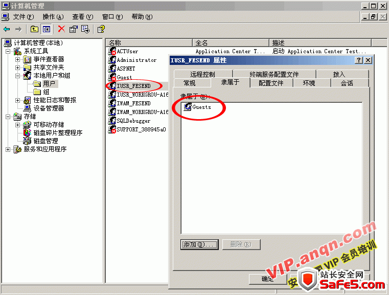 设置“IUSR_FESEND”帐号为“Guests”组,删除“Users”组