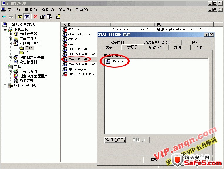 设置“IWAM_FESEND”帐号为“IIS_WPG”组,删除“Users”组