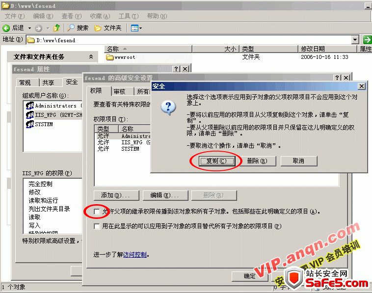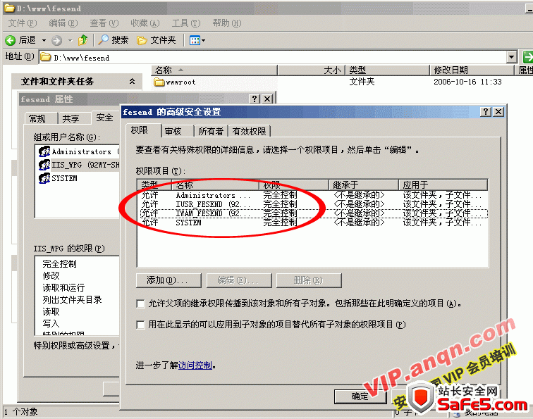 ⑷设定fesend用户站点根目录的安全权限,此示例的站点目录为“D:\www\fesend”,此目录用于存放fesend用户的站点数据;