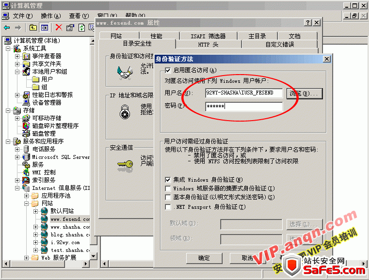 ⑴站点匿名访问帐号设置,修改成我们刚才建立的“IUSR_FESEND”帐号