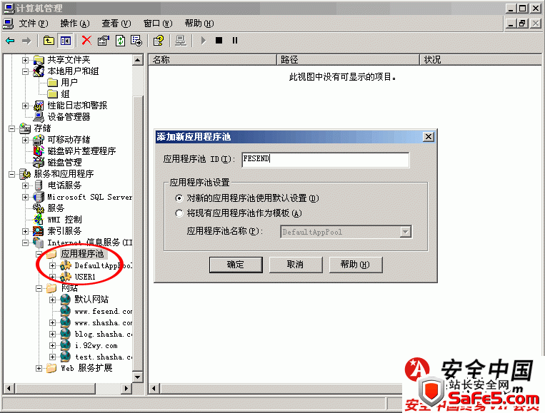 ⑵创建名称为“FESEND”(名称可以任意)的应用程序池;