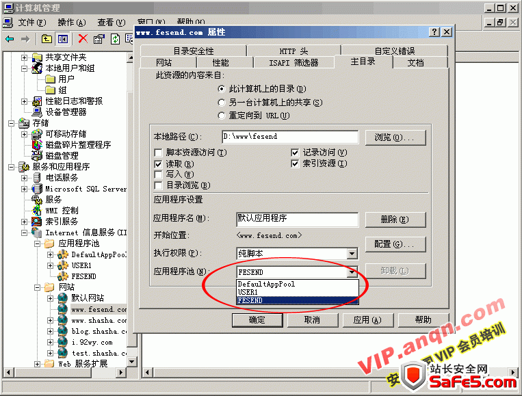 ⑶最后一步,设置“www.fesend.com”站点的应用程序池为上面建立的“FESEND”;