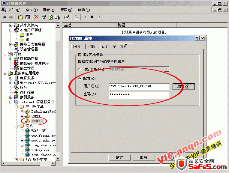 接下来右键FESEND应用程序池->属性;打开标识标签,选择“配置”,用户名密码选择我们刚才建立的“IWAM_FESEND”帐号,如下图所示: