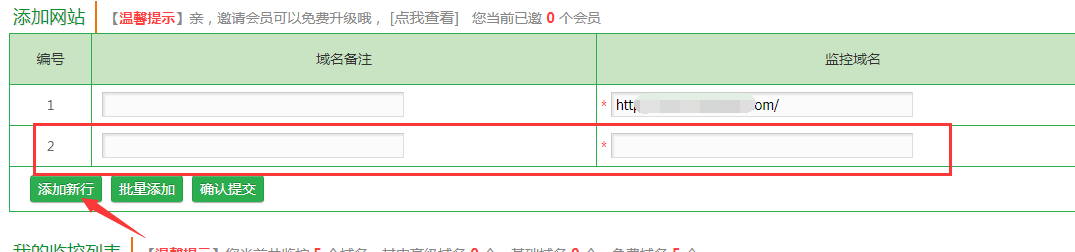 3、添加域名,输入你需要监控的域名,按要求添加就好了;多个域名添加,点击“添加新行”,然后批量提交,如图所示: