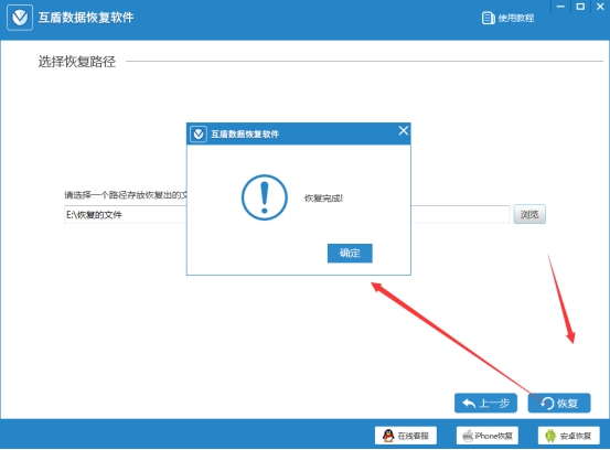第五步:通过点击【浏览】按钮选择恢复文件的存储位置后,点击【恢复】按钮来进行误删文件恢复的最后一步工作了,恢复操作完成后弹出提示框,点击【确定】按钮即可查看到恢复了的文件了,然后进行后续处理操作即可。