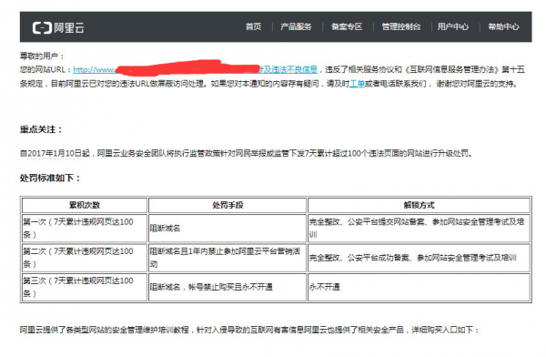 您的网站URL:http://www.********.com/weigui.html涉及违法不良信息,违反了相关服务协议和《互联网信息服务管理办法》第十五条规定,目前阿里云已对您的违法URL做屏蔽访问处理。如果您对本通知的内容存有疑问,请及时工单或者电话联系我们, 谢谢您对阿里云的支持。
