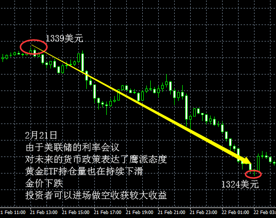 如图,在2月21日,由于美联储利率会议对未来的货币政策表达了鹰派态度,黄金ETF持仓量持续下滑,金价出现持续的下跌。投资者可以进场做空来收获较大的收益。