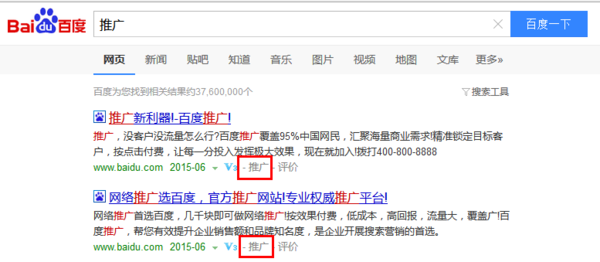 4、百度ppc广告,可以在短期内,通过花钱提高推广网站在搜索引擎中的排名,带来付费流量,每次点击都会收费,在信息展示下面写着”推广“(如图)