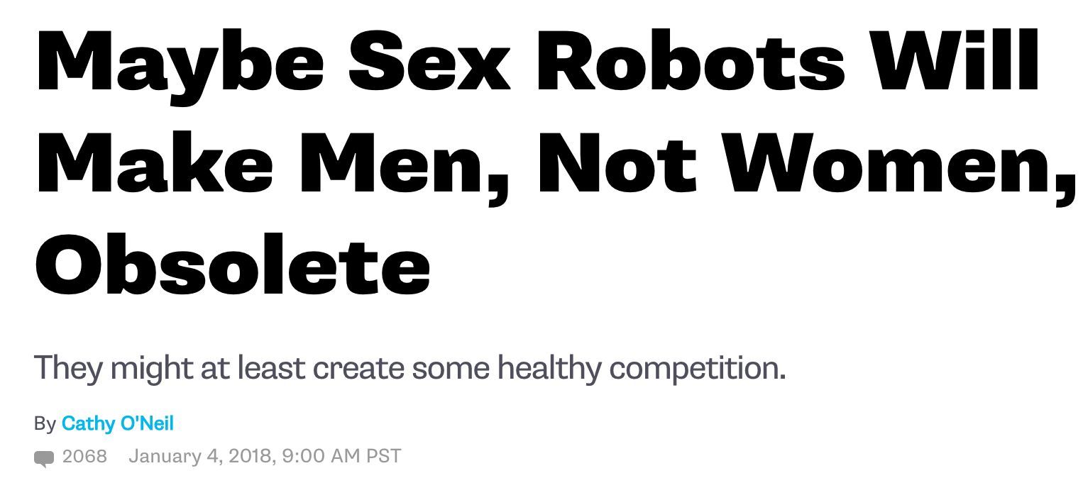 就好像彭博商业周刊1月4号发的这篇评论《或许,性爱机器人会让男人,而不是女人,彻底没市场》里提到的:以后也可能有男性机器人,女士可以选择和男性机器人在一起。这样,人类男性更要加把劲了,因为他们不仅要和其他男性竞争,还要和男机器人竞争。