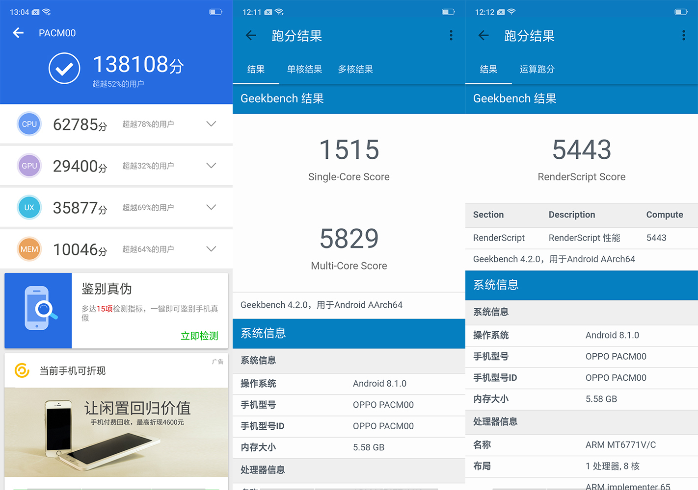 我们首先用多个跑分软件来测试处理器平台的理论性能,跑分结果显示,OPPO R15的安兔兔成绩为138108分,GeekBench 4.2跑分单核成绩为1515分,多核成绩为5829分,运算跑分5443分。