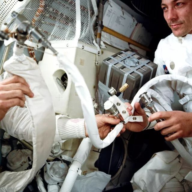 正在登月舱内就地取材,改造二氧化碳过滤器的宇航员们。图片:NASA