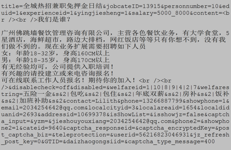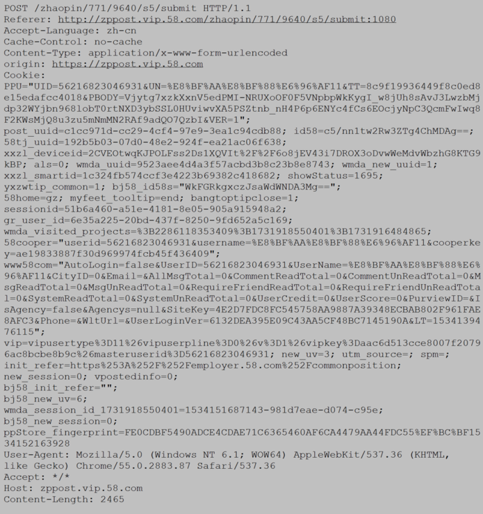 从这个接口所需要的相关参数看到,58VIP发帖的接口需要的参数非常多,这就要求黑灰产人员具备较强能力的协议接口分析能力,能够分析出哪些是必须的参数,哪些是可有可无的参数,以及哪些是风控系统必须检测的参数,和参数的值是否加密。如果加密,则需要黑灰产人员破解加密算法之后,再计算出新的参数值以此绕过风控系统的检测。