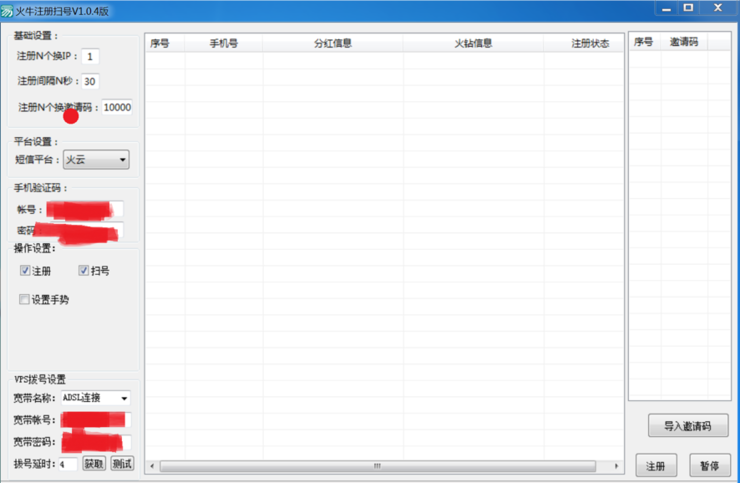 账号类工具软件主要针对注册场景和登陆场景,实现的功能包括批量注册、扫号、鉴权和越权等。以“火牛注册扫号软件”为例,该工具直接和接码平台对接,用于接收短信验证码;同时内置VPS拨号功能用于绕过厂商的IP限制策略,从而完成帐号的批量注册和扫号。