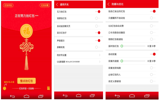 软件在后台运行,通过查找整个手机屏幕上满足上述截图图像所在的坐标,然后再模拟用户去点击操作,从而达到抢红包的目的。