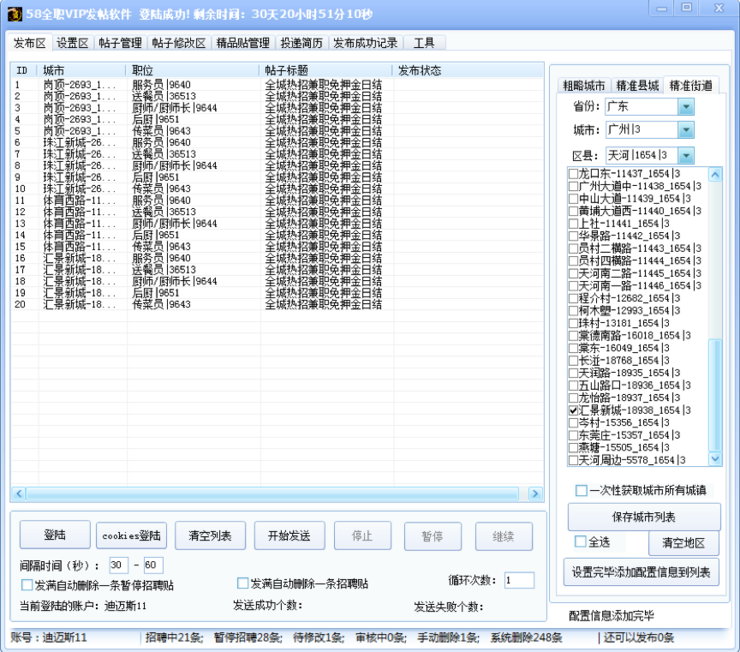 界面上会有很多发帖的相关设置,这些设置是黑灰产人员在分析58发帖的接口之后提取出来的,用户需要操作的一些变量值(包含发帖的省份、城市、街道、帖子标题、帖子职位等接口所需要的一些参数)。