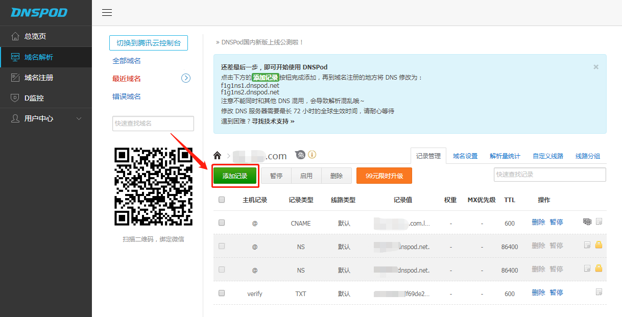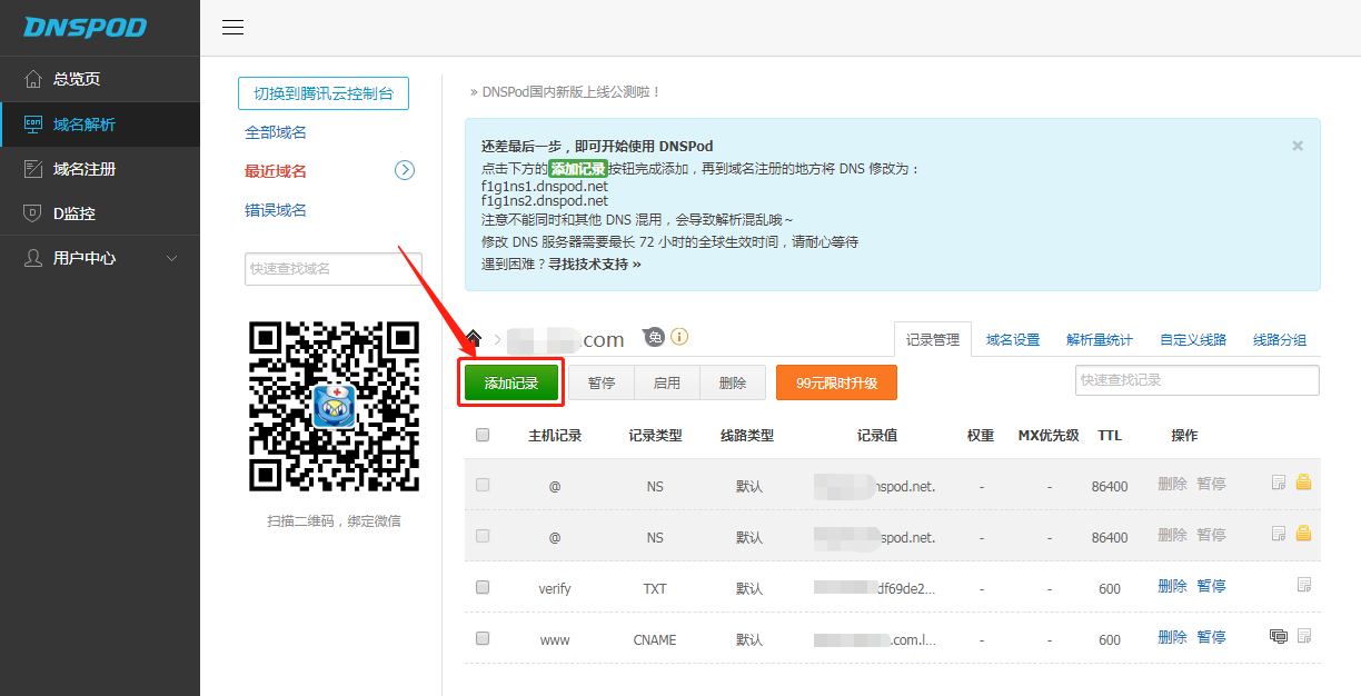 设置域名解析记录,需要登录到具有该域名管理权的解析平台,本文以DNSPod解析平台为例。