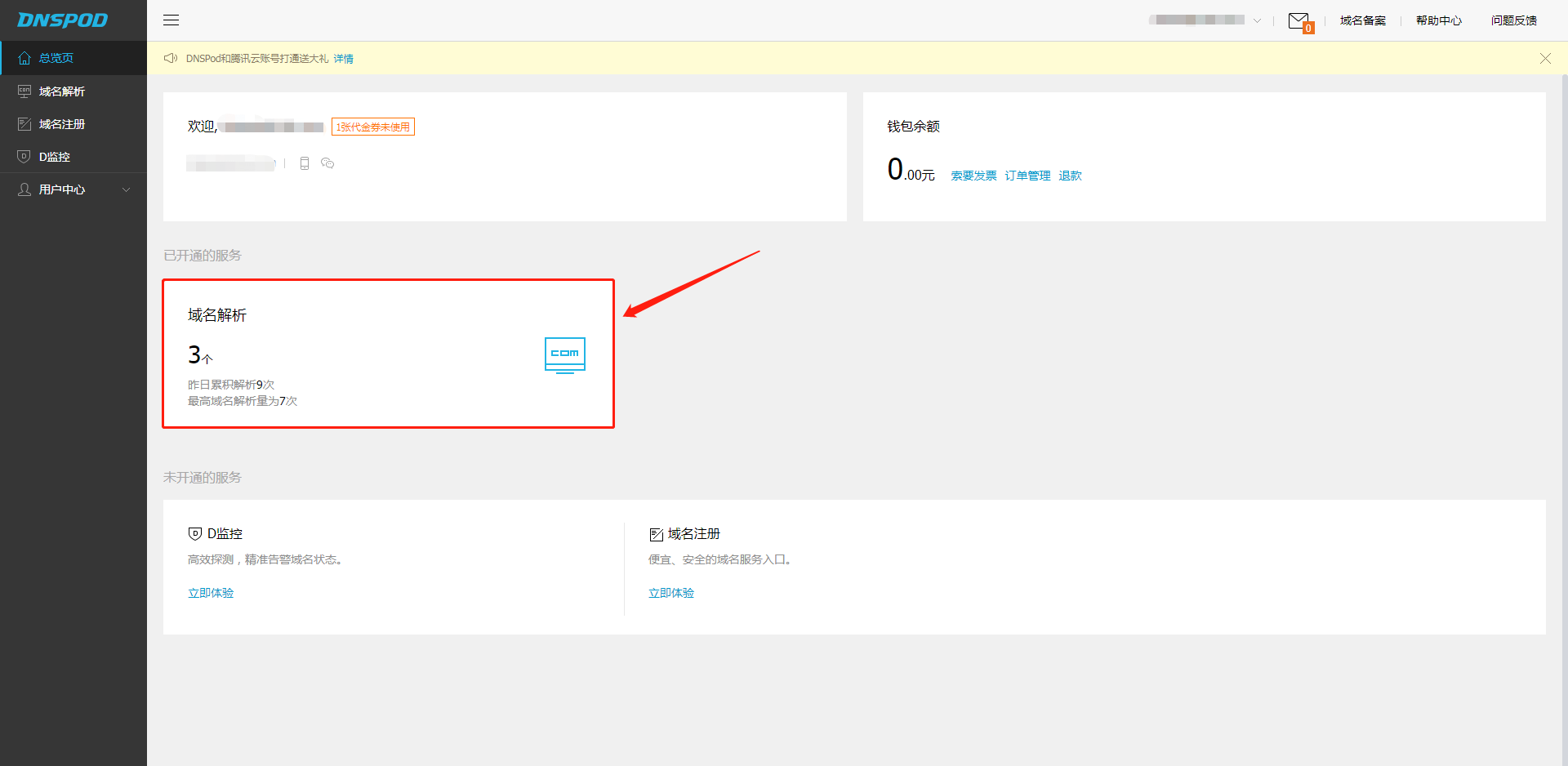 登录DNSPod解析平台后,点击“域名解析”并且点击需设置解析记录的域名。