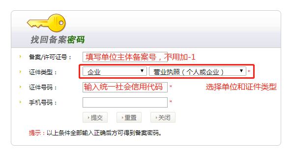 3、输入主体备案号和证件号码后点击提交,备案密码会发送到主体负责人的手机短信和邮箱中,请注意查收