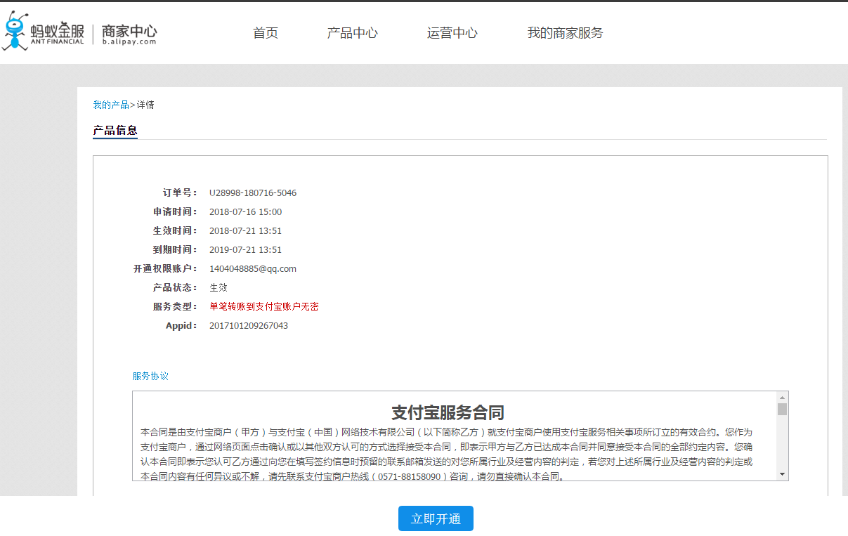 开启支付宝提现的前提是:①已配置支付宝支付;②在支付宝商户平台中开通“转账到支付宝账户”的产品。下面描述开通教程。