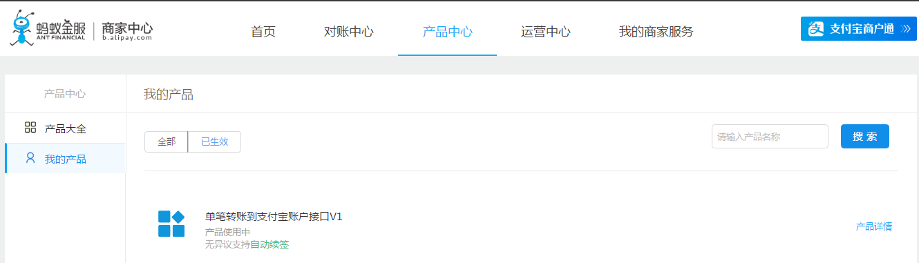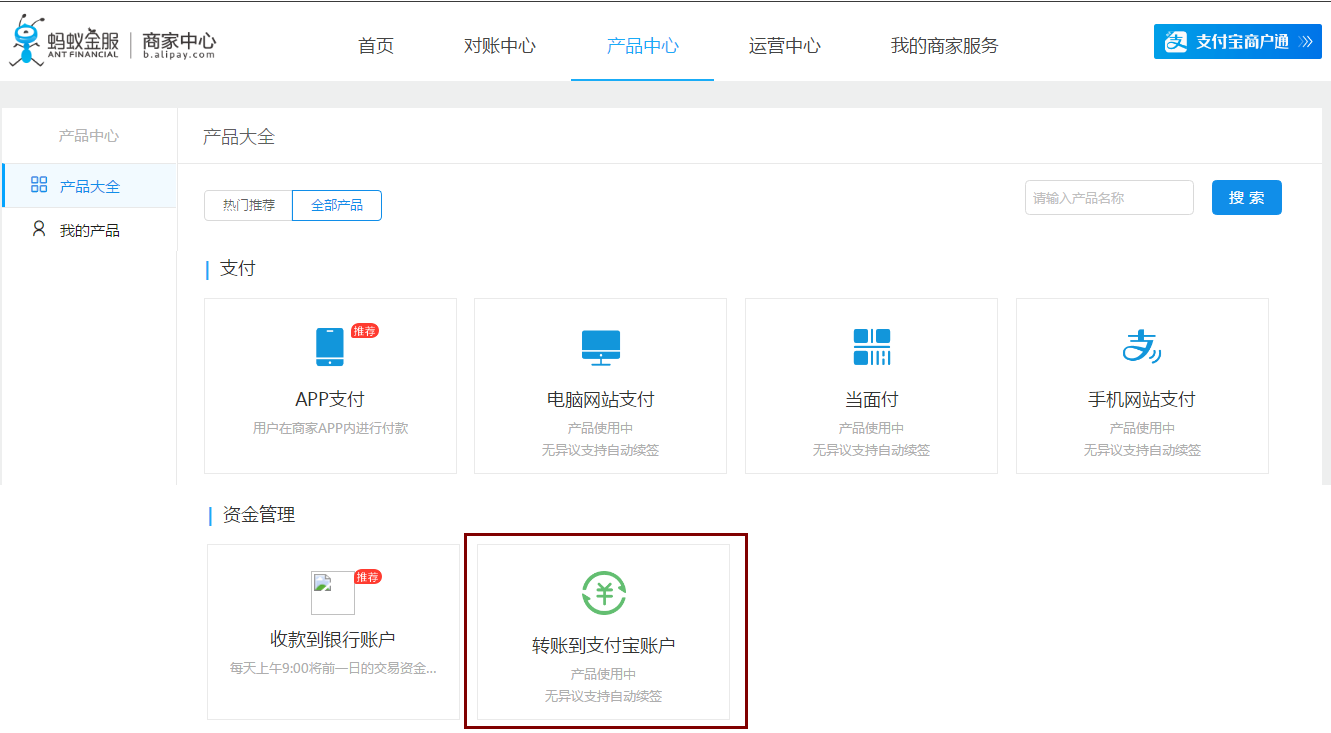 一、登录支付宝商户平台,点击产品中心-转账到支付宝账户