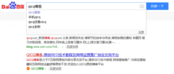 百度下拉框就是当我们在百度搜索框中输入一个关键词,比如:QICQ博客,下方所展现出来的更多的相关关键词,这种就属于百度下拉框。