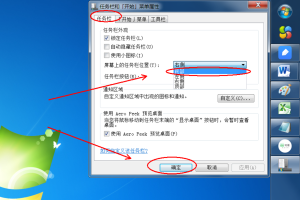 2、点击“屏幕上任务栏位置”后面的选项框,并选择“底部”,然后点击下方的确定按钮即可。