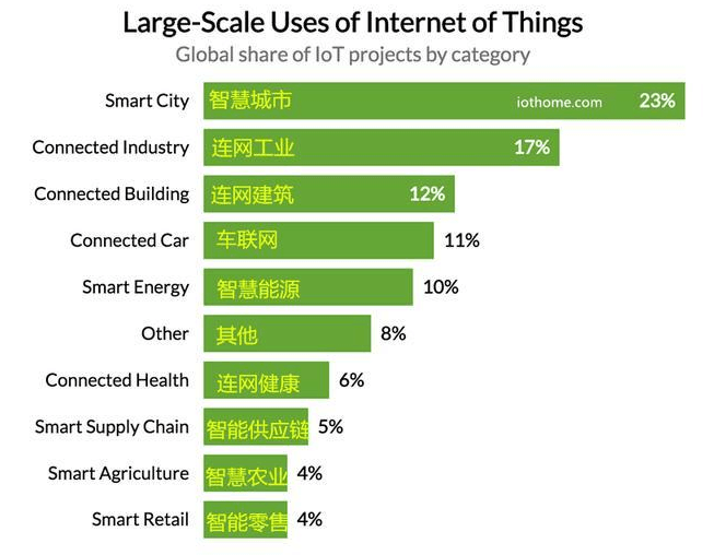 工业物联网中的最大类别是智慧城市,它通常涉及交通监控、停车管理和其他应用项目,这些项目可以让政府分析其城市的运作情况。排在前三位的工业物联网使用案例是连网工业(非工厂环境中的物联网设备,如采矿作业)和连网建筑(通常使用监控来提高建筑能源使用效率)。