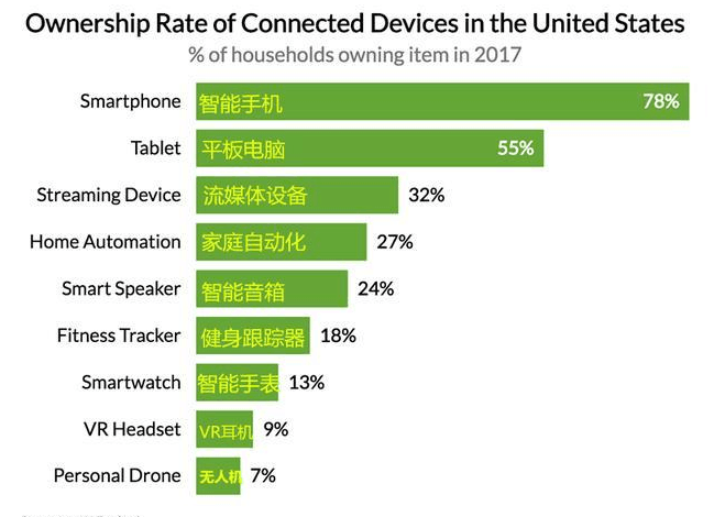 在消费者方面,什么是最受欢迎的物联网设备?市场研究企业Walker Sands的一份报告显示了2017年美国家庭中各种连网设备的拥有量。虽然智能手机和平板电脑严格意义不算是 “物联网”设备,但它们也包含在下表中以供参考。