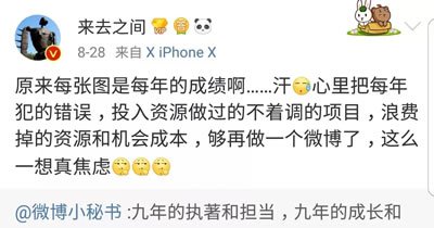 2018年8月28日,微博CEO来去之间转发庆祝微博九周年的时候说了这样一段话:“把每年犯的错误,投入资源做过的不着调的项目,浪费掉的资源和机会成本,够再做一个微博了,这么一想真焦虑。”