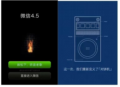 在2013年2月微信的4.5发布了,在这一次新版本的启动介绍页上,赫然写着“这一次,我们重新定义了对讲机”。
