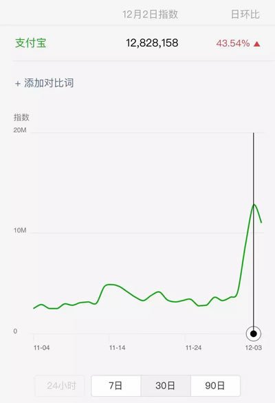 据数据显示,自“红包活动”发起以来,“支付宝”微信指数的搜索热度,日环比最高增长43.54%,达到一个月以来的峰值。微博上,话题热议度也一路飙升。