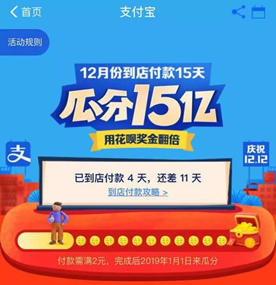 与支付宝去年10亿圣诞红包的玩法不同,今年,支付宝除了常规红包补贴外,还新增一个玩法——12月份到店付款15天,即可瓜分15亿奖金。