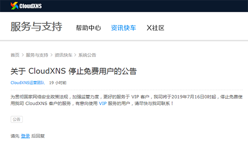 为贯彻国家网络安全政策法规,加强监管力度,更好的服务于 VIP 客户,我司将于2019年7月16日0时起,停止免费使用我司 CloudXNS 客户的服务,有意向使用 VIP 服务的用户,请尽快与我司联系!