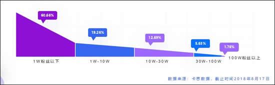 10W粉以上的蓝V号总占比20.08%,其中拥有100W粉丝以上的蓝V号仅占比1.76%。蓝V号分布也呈现比较明显的金字塔结构。