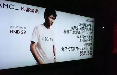 以个性著称的青年作家韩寒喊着“爱网络,爱自由,爱晚起……我不是什么旗手,不是谁的代言,我是韩寒,我只代表我自己。我和你一样,我是凡客”。