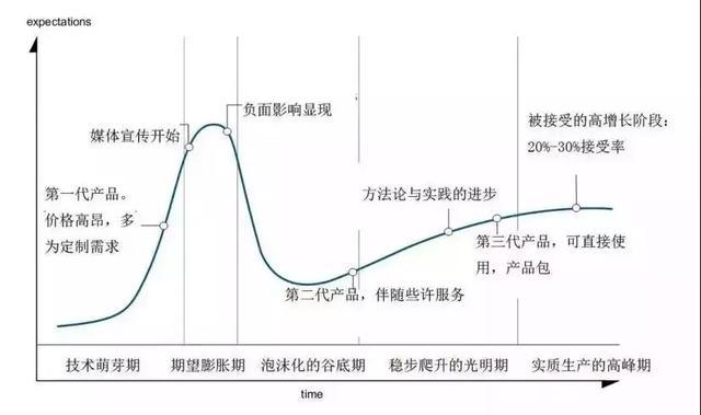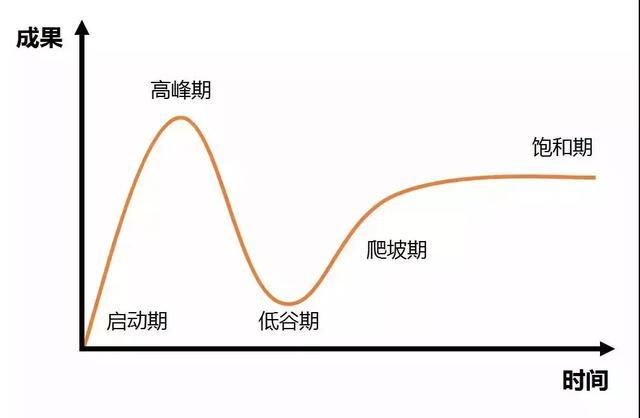 借助一个用于描述技术发展周期的专业术语“Gartner曲线”来说,一个事物从萌芽到成熟,必然要经历五个阶段,即:启动期→高峰期→低谷期→爬坡期→饱和期。