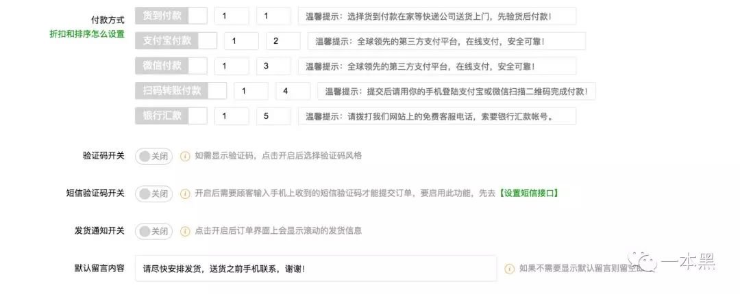 接着设置付款方式,系统支持五种方式,且折扣和排序可随喜好自行设置。