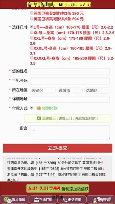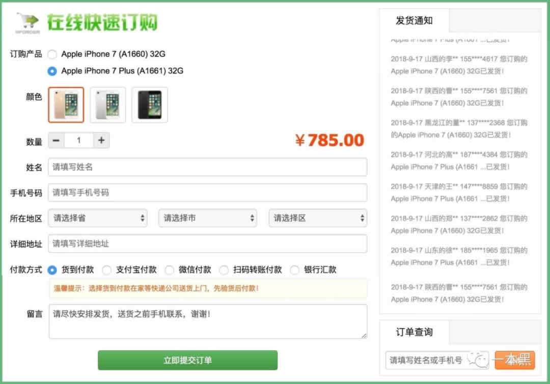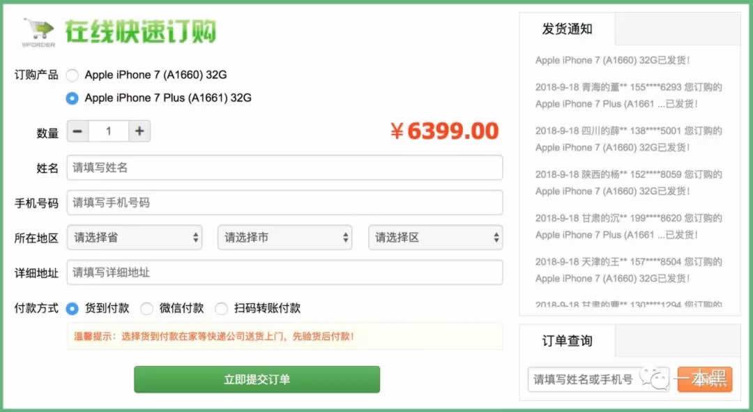 小W订单系统生成的在线订购页面,在难以分辨真伪的情况下,页面大多辅以滚动模块,以此刺激大众的消费冲动心理,从而上当受骗。